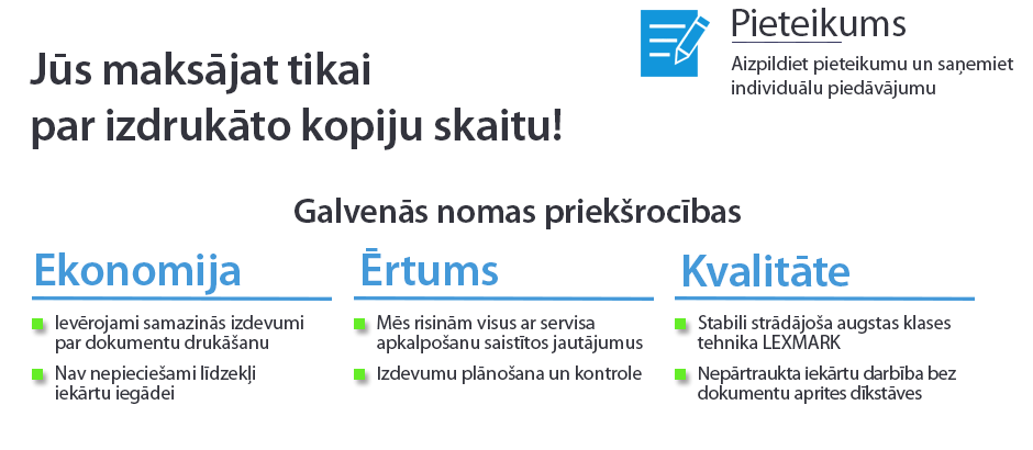 · Garantija – visi LEXMARK produkti ir sertificēti un nodrošina uzticamu un efektīvu darbību. Apkalpošanu veic augsti kvalificēti darbinieki, izmantojot oriģinālos izejmateriālus;